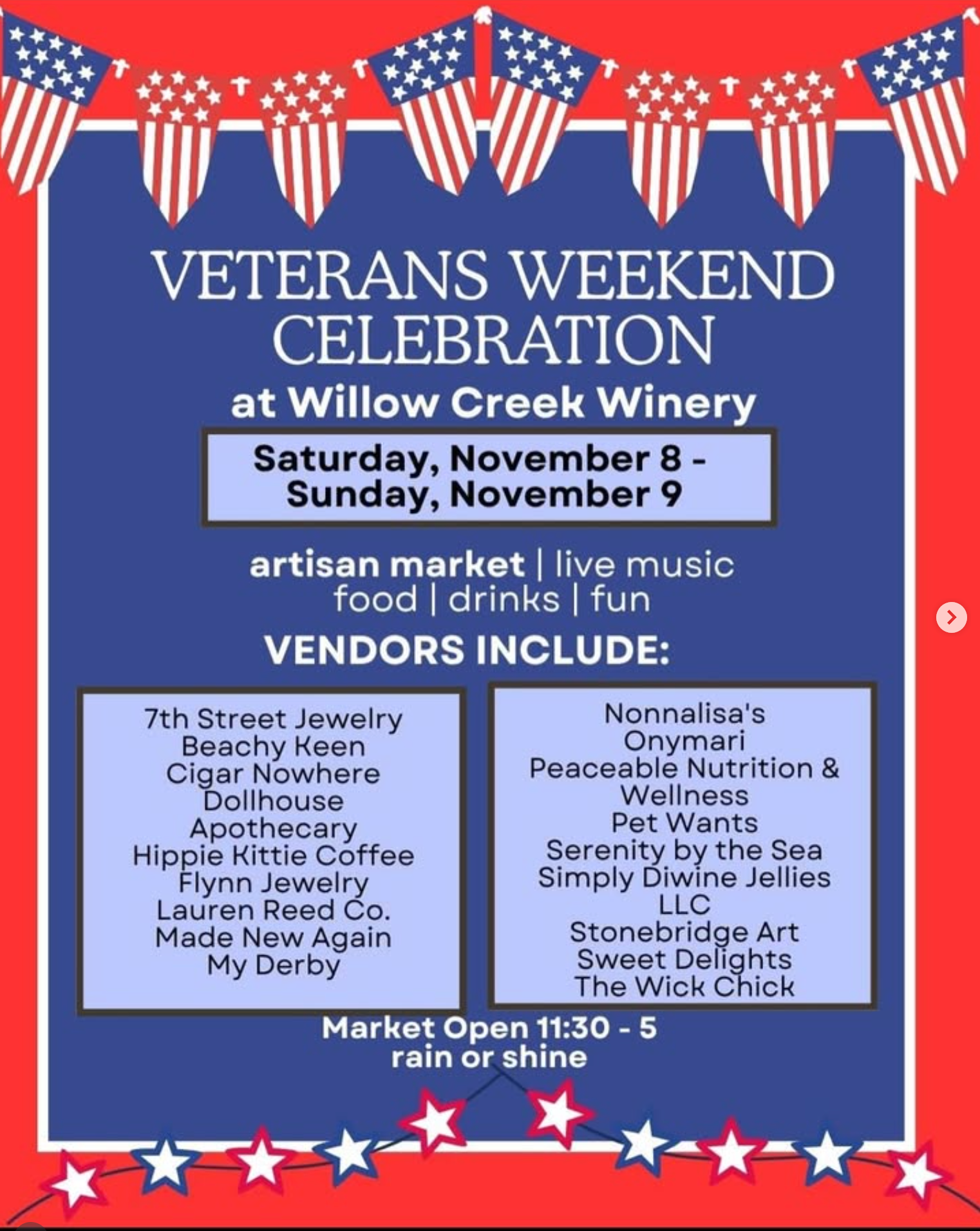 We are thrilled to be part of Willow Creek Wineryโs Veterans Day Celebration this weekend โ and weโve got some special treats waiting just for you! ๐ท๐บ๐ธ๐๏ธ