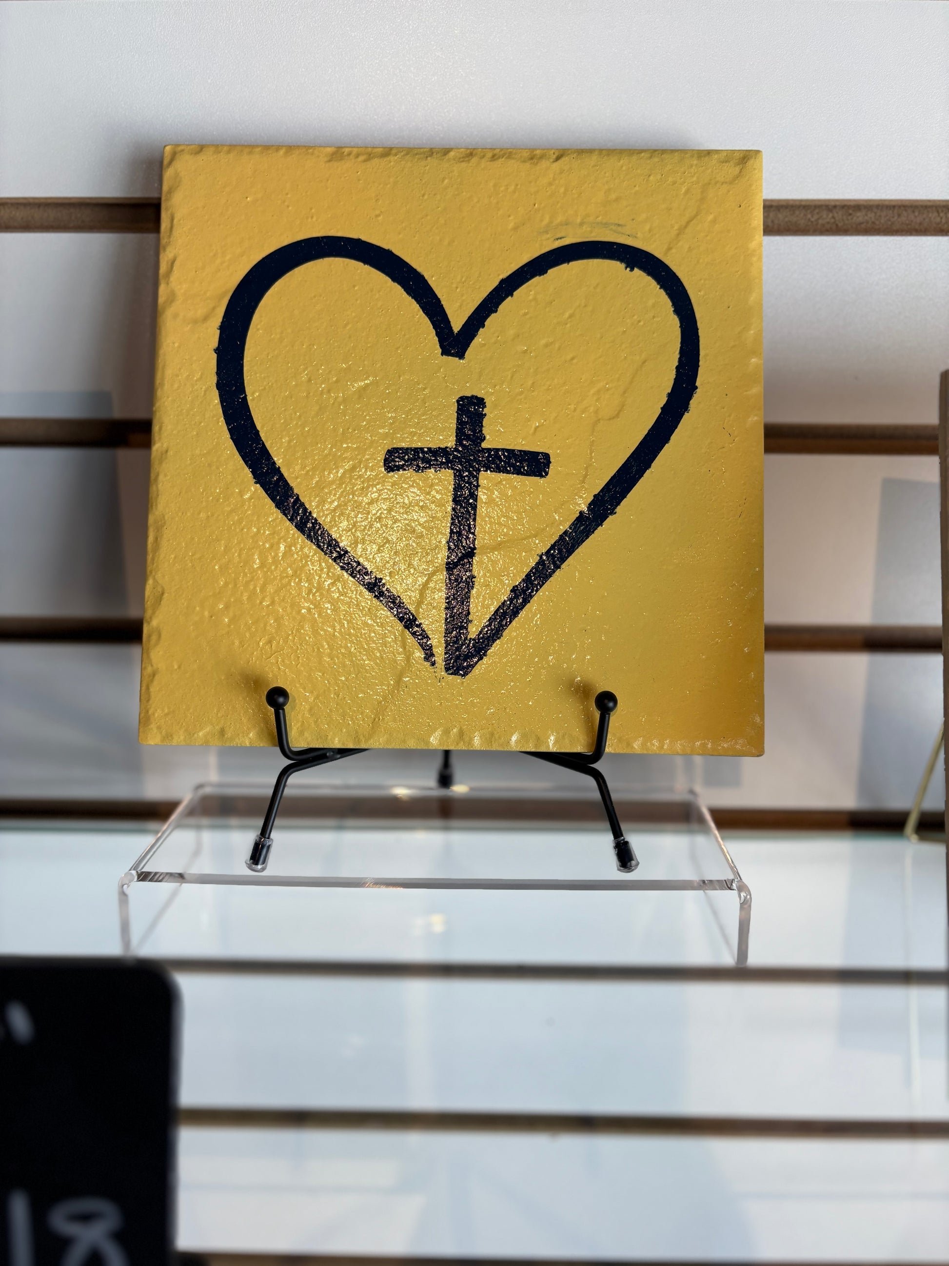 Add a touch of love to your home with our Love the Way Tile. Hand painted in vibrant yellow, this creatively connected heart and cross design will bring warmth and charm to any room. A perfect way to express your love and style.