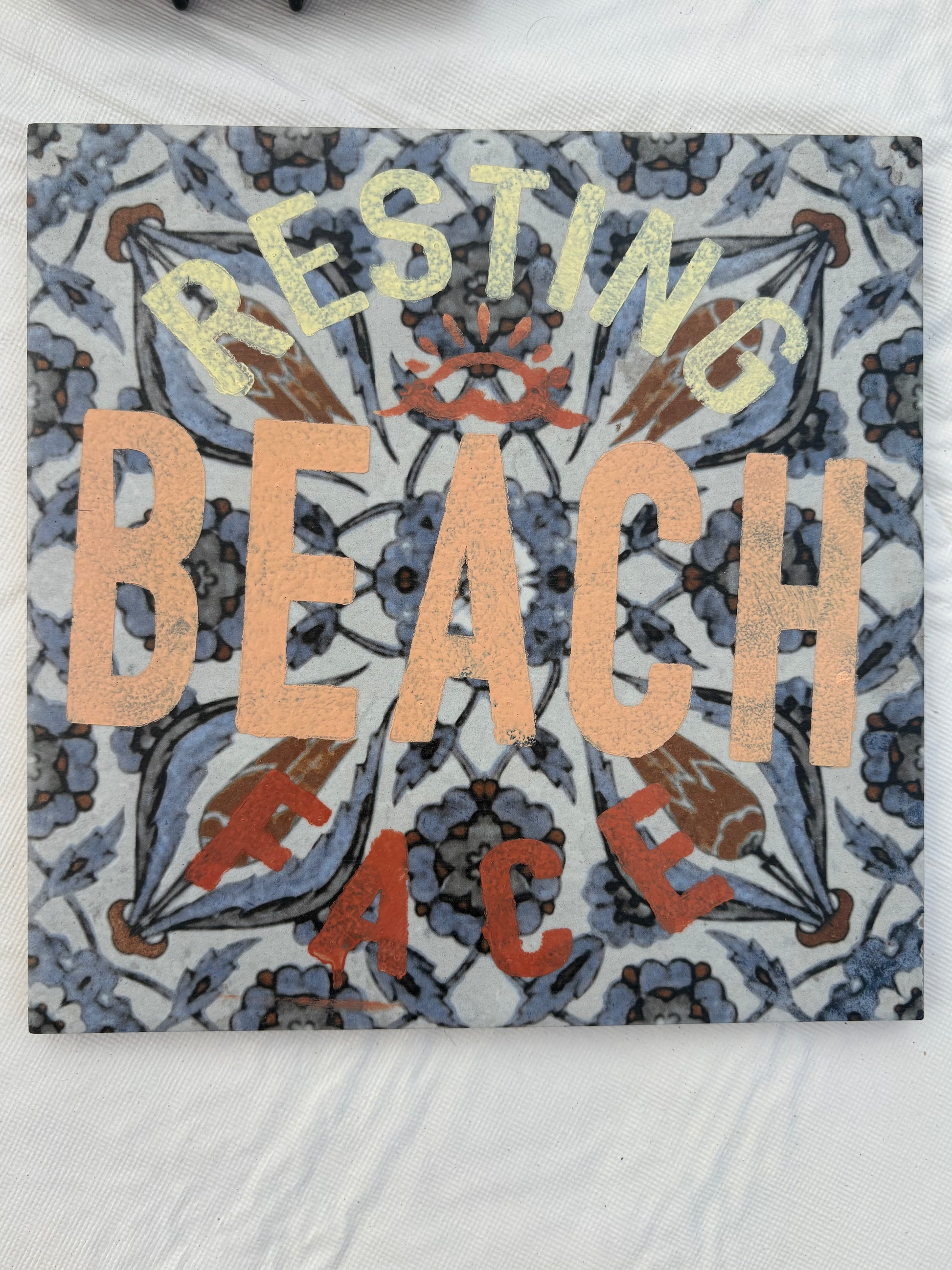 Spice up your kitchen with our Resting B. Face Trivet! Made with repurposed tile and hand painted with a playful "resting beach face" design, it adds personality, humor, and protection for your countertops. Show off your laid-back style and don't take yourself too seriously with this charming addition to your home.