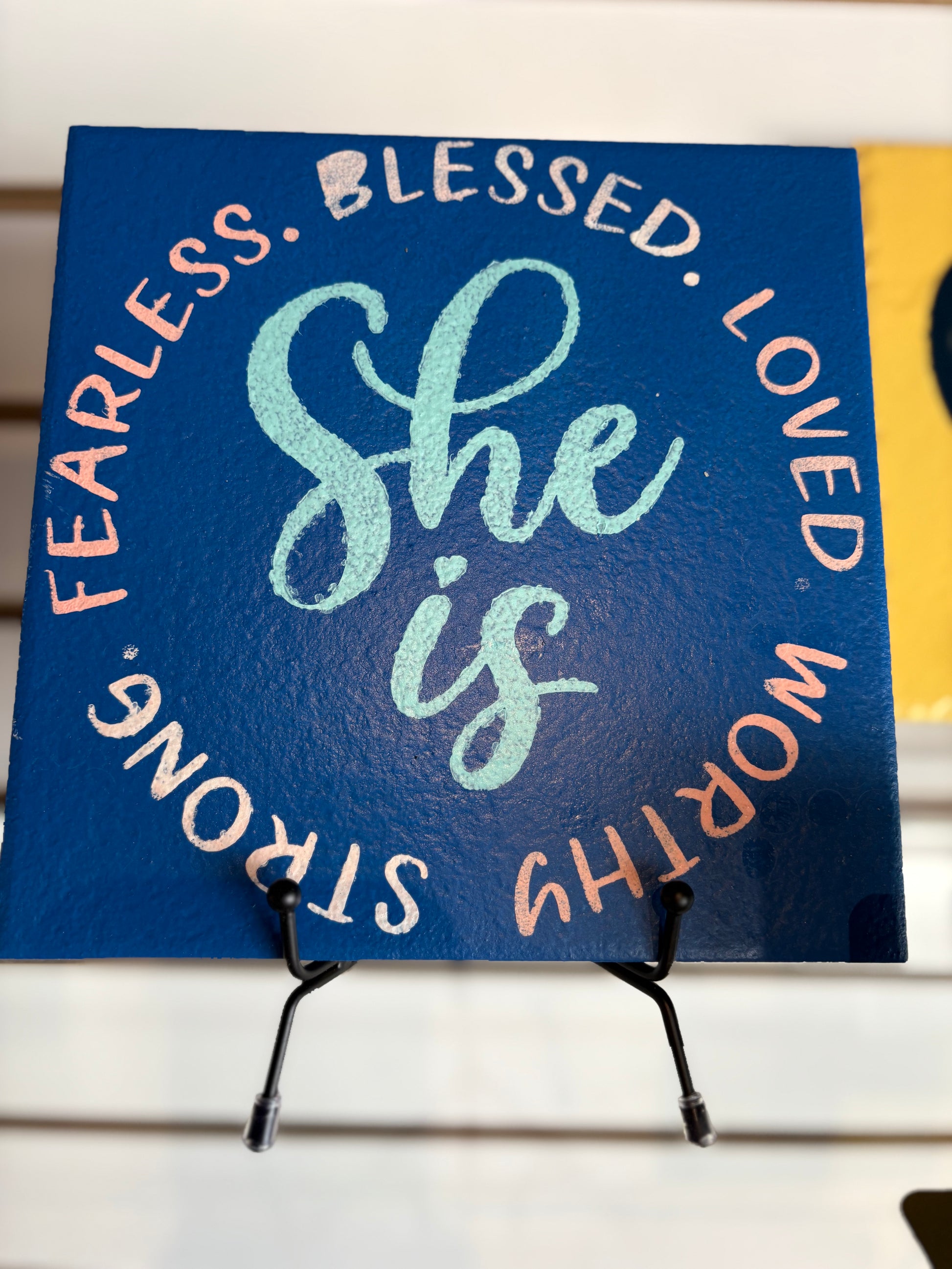 Add a quirky touch to your kitchen with the “She Is” Tile. This 8” x 8” trivet can be used as a heat plate or a fun decoration. Show off your inner strength and sass with a touch of wordplay. (Can't handle the heat? Let “She Is” handle it for you!)